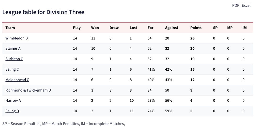 | 18-03-2024 | Away | Hounslow B | 3.5-2.5 |
