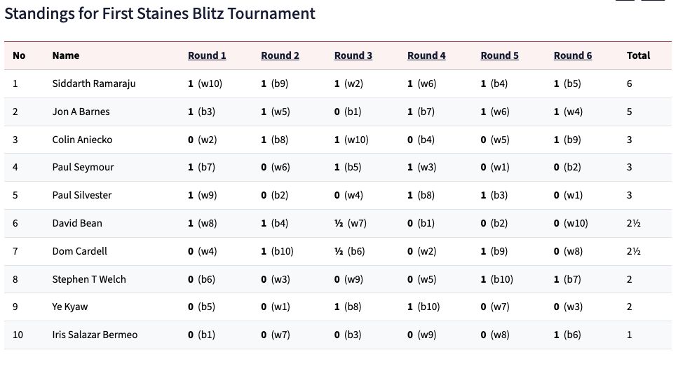 Our First Staines Blitz Tournament. The format was a 6-round swiss with 5min+3sec time control. Congratulations to Siddarth for finishing top with 6/6 and to Jon for a close second.