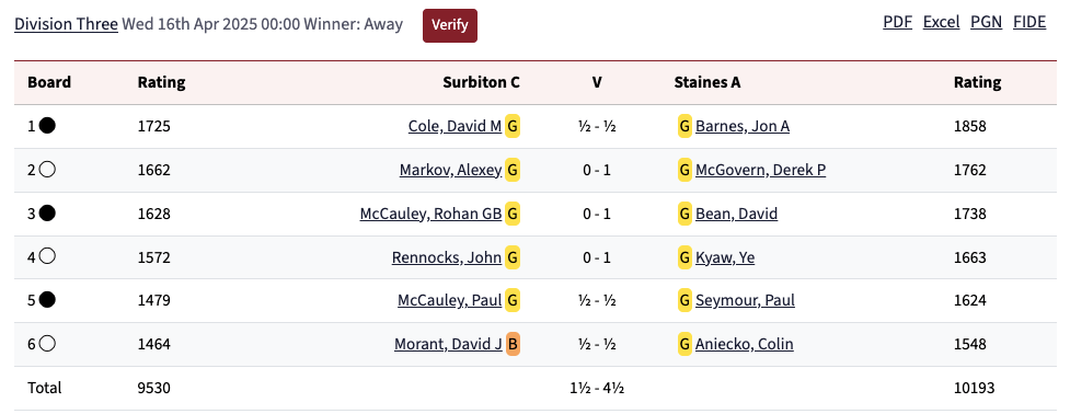 Staines A 3.5-2.5 Surbiton B. Up to third in the league with another close victory against a strong Surbiton side.
